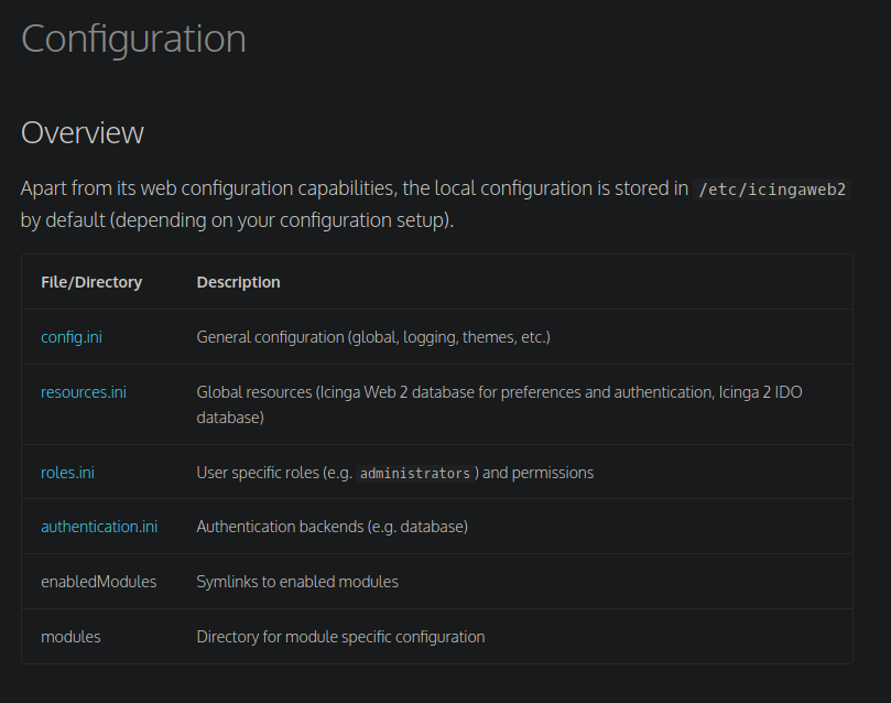 - Icinga default config files: https://icinga.com/docs/icinga-web/latest/doc/03-Configuration/