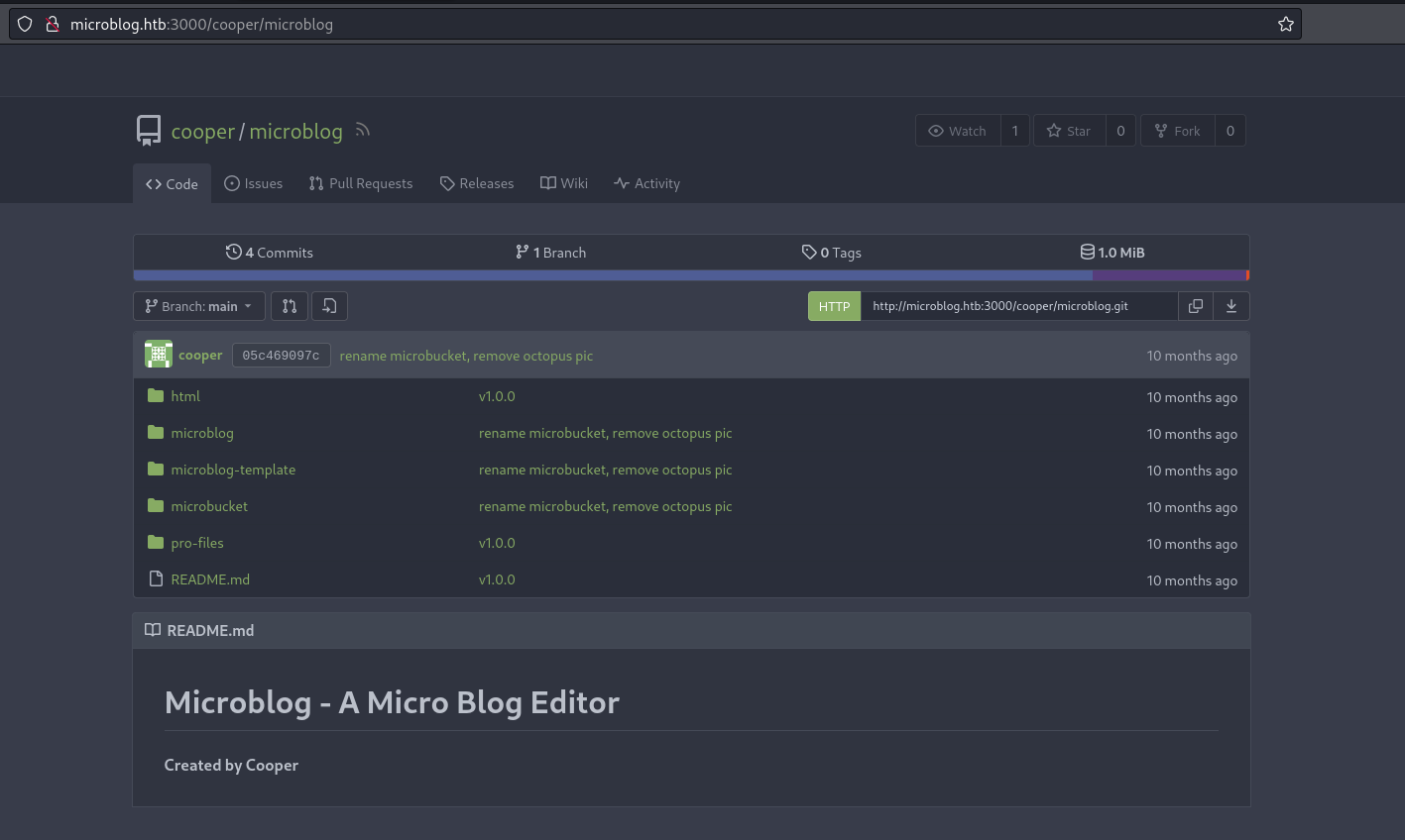 - http://microblog.htb:3000/cooper/microblog (Microblog Git) (Dangerous)
