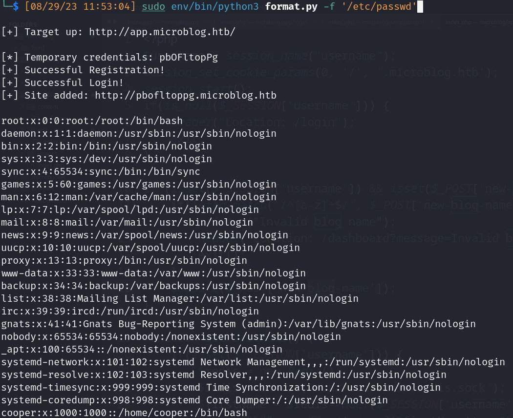 - Code analysis (http://microblog.htb:3000/cooper/microblog.git)