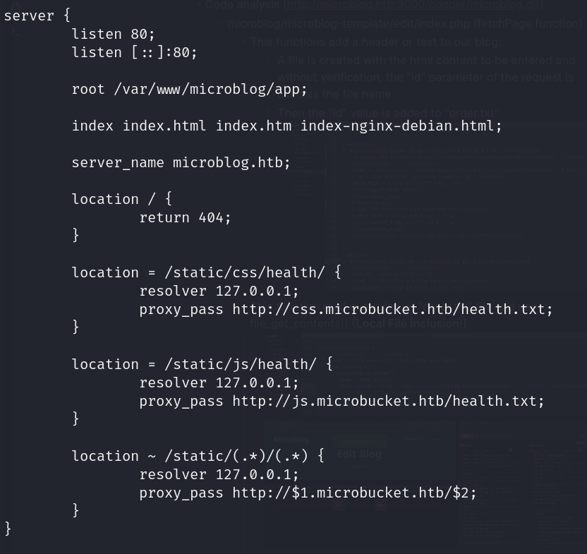 - Nginx server configuration file (/etc/nginx/sites-available/default) (http://app.microblog.htb)
