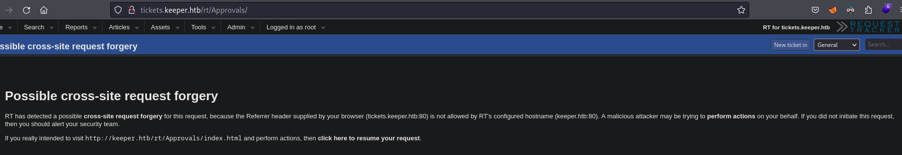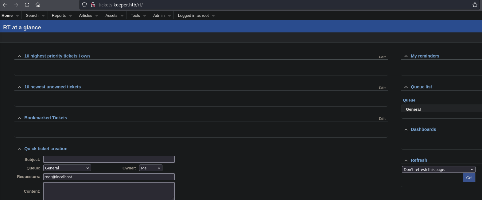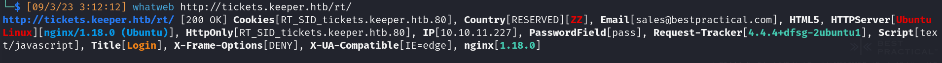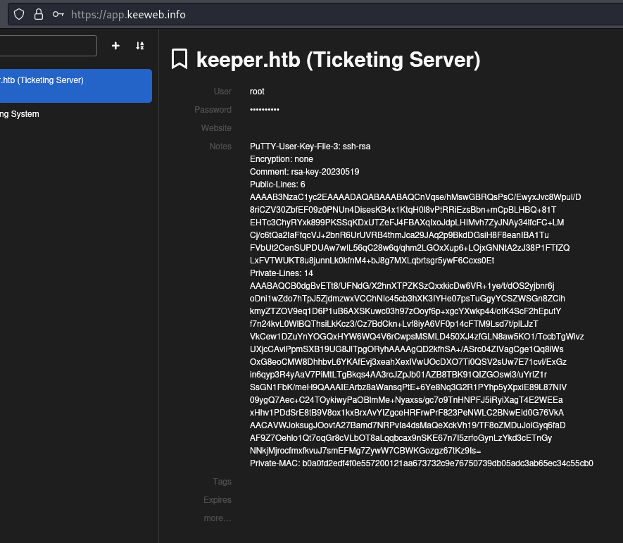 - Link to an IT Support Ticket domain: http://tickets.keeper.htb/rt/