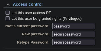 - Disable root user access, remove privileges or change default password