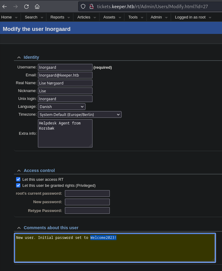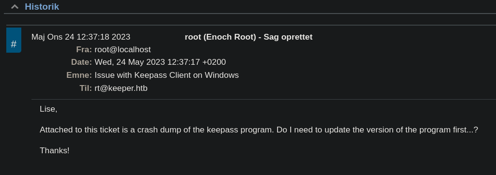 - Inorgaard (id:27)(Name: Lise Nørgaard)(Email: lnorgaard@keeper.htb)