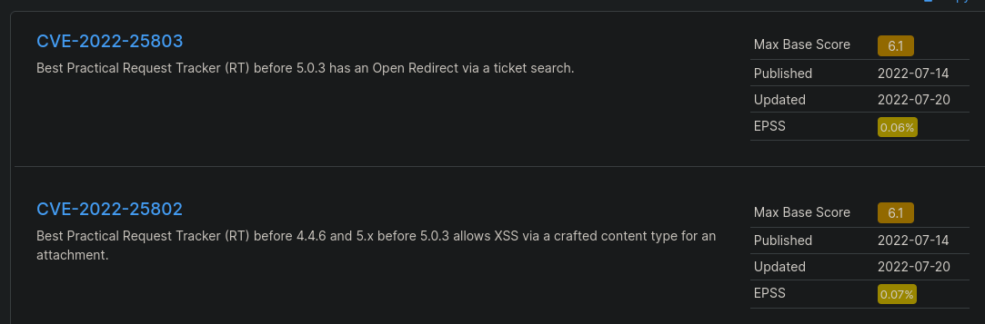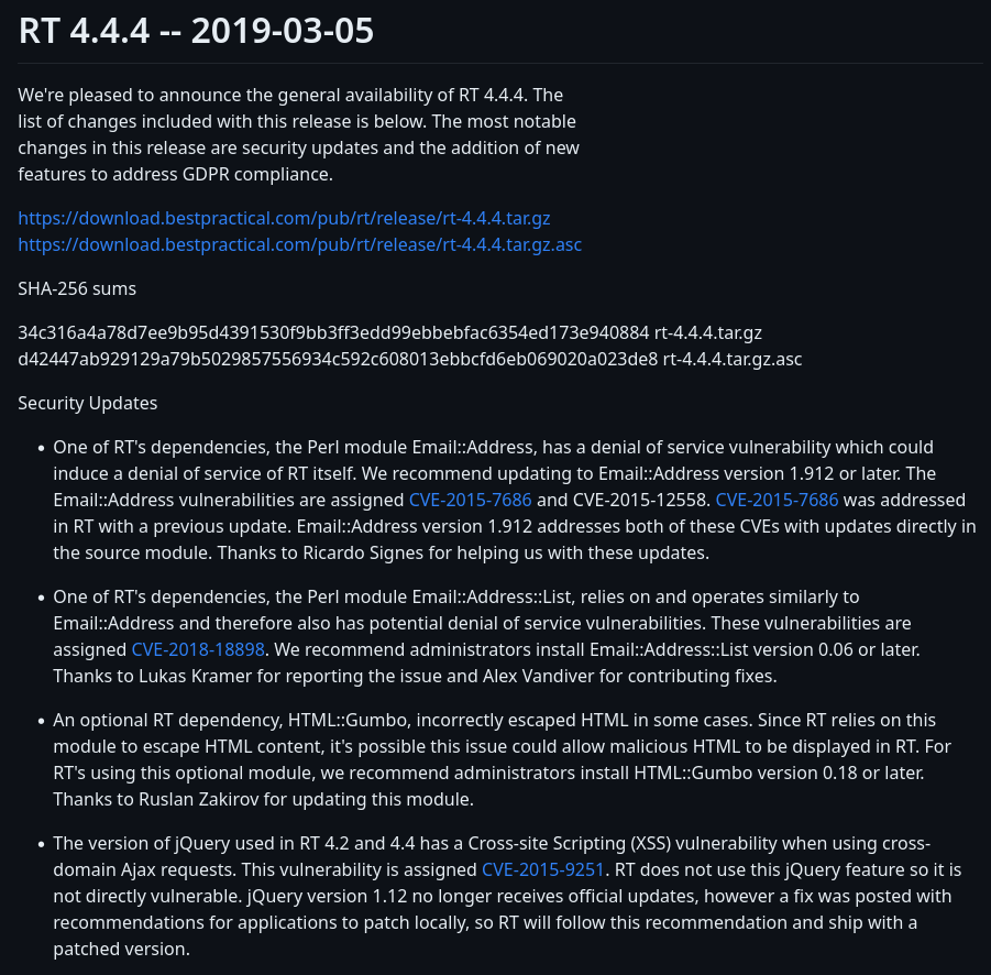- CVEs version https://www.cvedetails.com/vulnerability-list/vendor_id-8416/product_id-14710/Bestpractical-Request-Tracker.html: