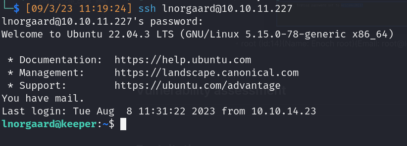 - Valid SSH credential (Reuse Credentials) (lnorgaard:Welcome2023!)
