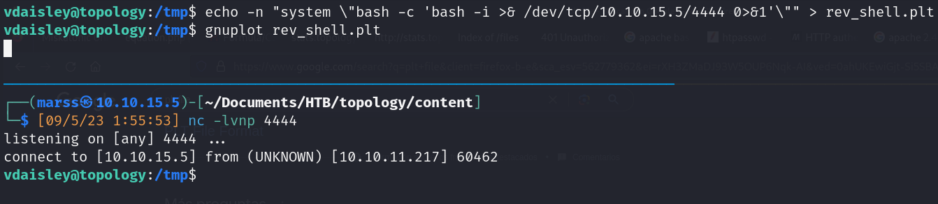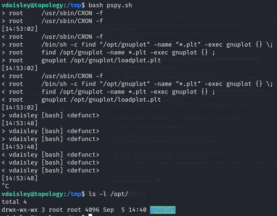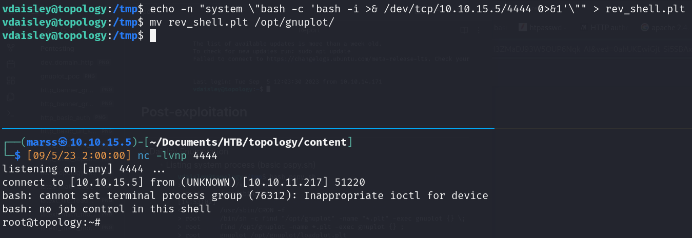 - Create .plt file with reverse shell, move file to /opt/gnuplot directory (write access), wait one minute aprox and gain access
